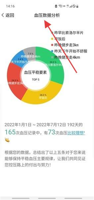 3、記錄完成后,可進入血壓數據分析頁面,查看血壓數據的統計、分析結果。