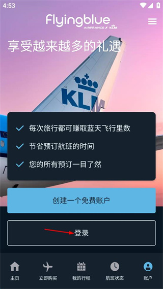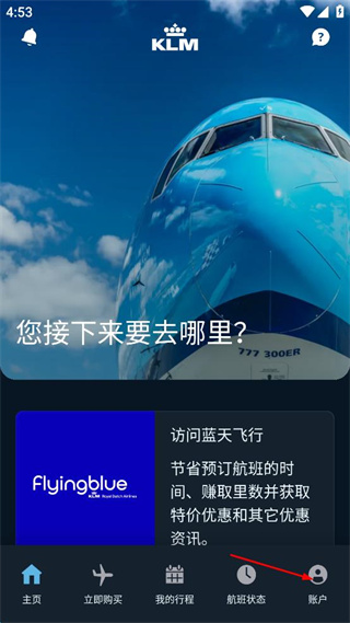 1、打開KLM軟件主頁,點擊底部導航欄的賬戶選項,進入對應的賬戶頁面。
