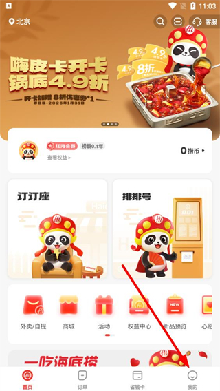1、打開海底撈APP,點擊底部導航欄最右側的我的,進入個人頁面。
