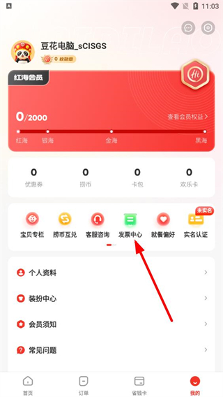 2、在個人頁面中,找到發票中心選項并點擊,進入發票中心界面。
