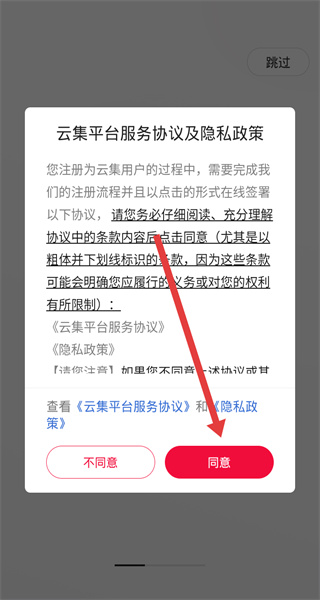 1、點擊“云集平臺服務協議及隱私政策”彈窗的“同意”,進入云集APP首頁。
