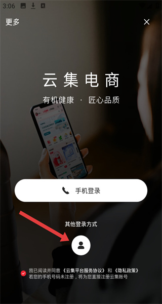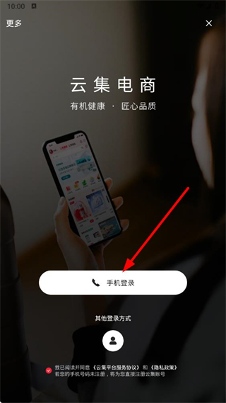 1、在云集app首頁,點擊底部登錄注冊按鈕,進入登錄選擇界面。