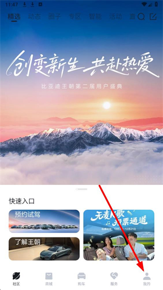 1、在比亞迪界面,點擊底部的社區選項,進入社區相關頁面。