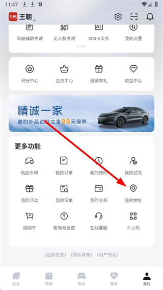 2、在個人頁面的更多功能區域,找到我的地址選項并點擊,進入收貨地址管理界面。