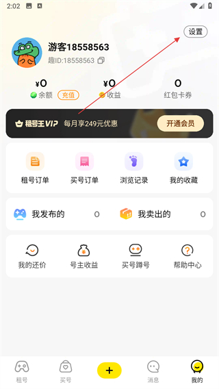 1、打開租號王進入我的頁面,找到右上角的設置按鈕,點擊進入設置界面。