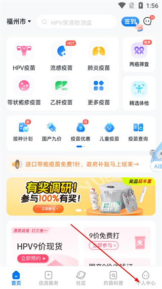 1、打開約苗App的首頁,點擊HPV疫苗選項,進入疫苗列表頁面。