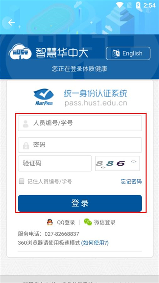 3、進入智慧華中大統一身份認證頁面,輸入人員編號/學號、密碼、驗證碼,點擊登錄。