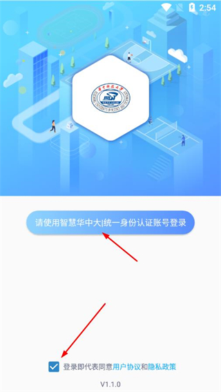 2、在登錄頁面,勾選協議和后,點擊請使用智慧華中大統一身份認證賬號登錄。