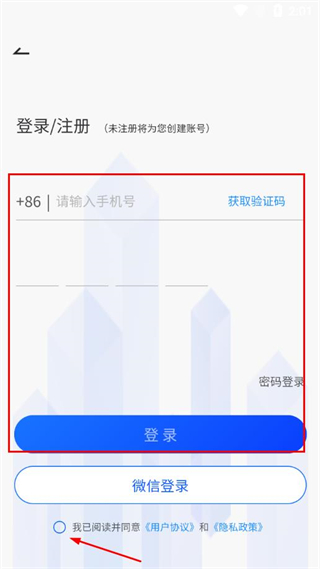 3、在該頁面填寫手機號,獲取并輸入驗證碼,勾選協議,點擊登錄。