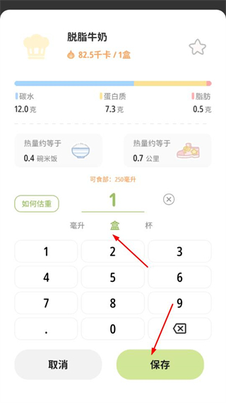 3、手動修正功能:長按標簽可切換食物單位(如碗→克)