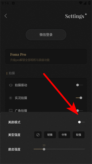 3、開啟美顏模式開關,可調節美顏強度等參數,完成美顏設置。
