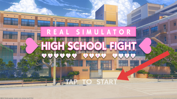 1、畫面有“REALSIMULATORHIGHSCHOOLFIGHT”標題,點擊【TAPTOSTART】(點擊開始)提示,背景是校園場景。