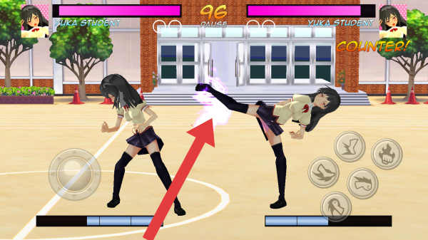 3、角色名為“YUKASTUDENT”,呈現校園操場格斗場景,有“COUNTER!”(反擊)提示,還有操作按鈕。