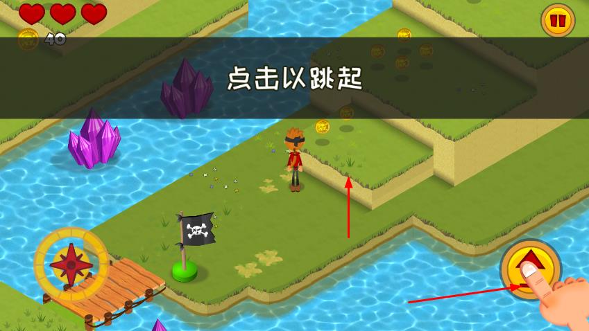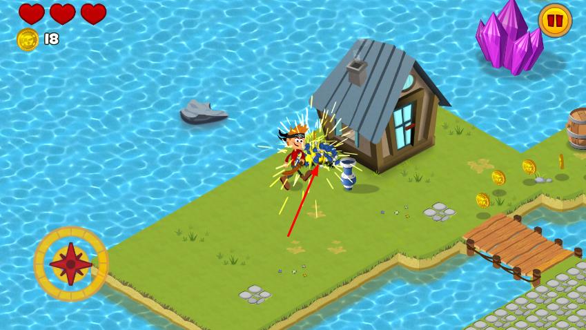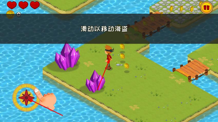 1、操控海盜角色開始冒險,通過滑動屏幕左側的方向輪盤,控制海盜在島嶼場景中移動,探索島嶼上的各個區域,收集尋找金幣、紫色水晶等物品 。