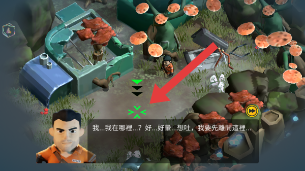 2、呈現了游戲內的場景,需要帶領角色離開這里,可以跟隨地上圖標的指引進行移動,處于新手教程的頁面。