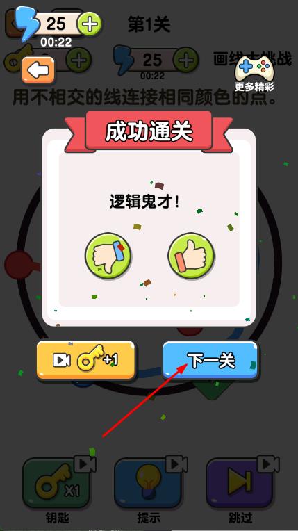 3、成功用不相交的線連接所有相同顏色的點后,點擊下一關按鈕,進入下一個關卡繼續挑戰。
