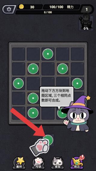 1、畫面呈現了新手指引的頁面,需要根據提示拖動下方的方塊到地圖區域,三個相同點數即可合成。