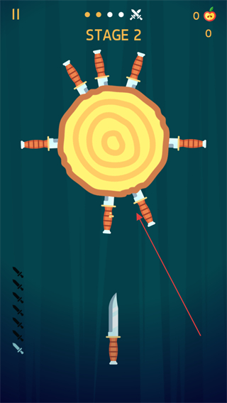2、繼續發射飛刀,避開已插入的飛刀,確保每把都能插入木盤。