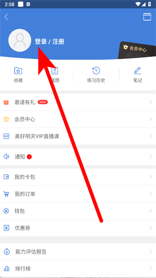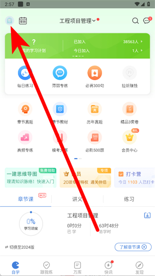 1、打開建造師萬題庫,點擊頁面左上角的頭像圖標,進入個人相關頁面。