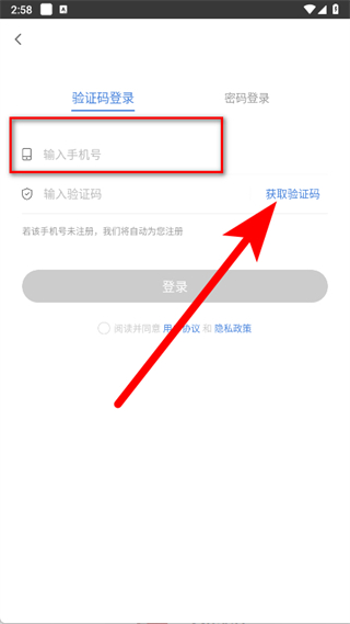 3、在驗證碼登錄頁面,輸入手機號碼后,點擊獲取驗證碼。