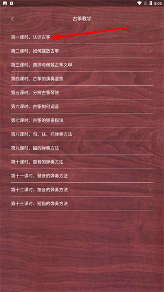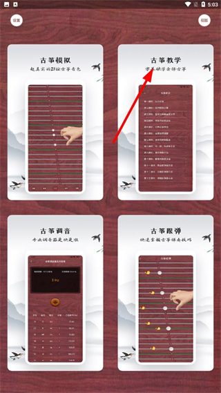 2、在功能選擇頁面,點擊古箏教學,進入古箏教學課程列表頁面。