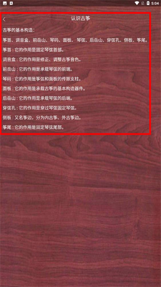 4、在認識古箏課時學習頁面,查看古箏各部分構造及作用的介紹內容。