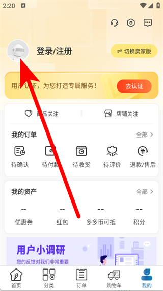 2、在個人頁面,點擊登錄注冊區域,進入登錄頁面。