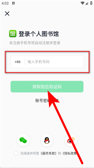 3、在登錄頁面,輸入手機號碼,點擊獲取短信驗證碼。