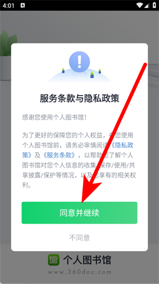 1、打開個人圖書館,在彈窗中,點擊同意并繼續。