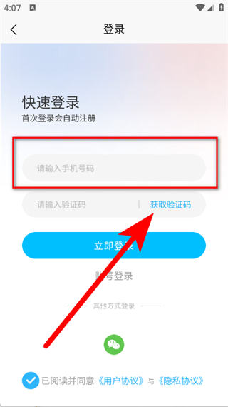 3、在登錄頁面,輸入手機號碼,點擊獲取驗證碼。