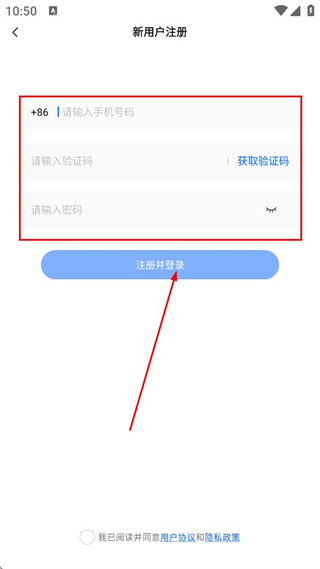 4、輸入手機號、驗證碼、密碼,點擊注冊并登錄,完成賬號注冊操作。