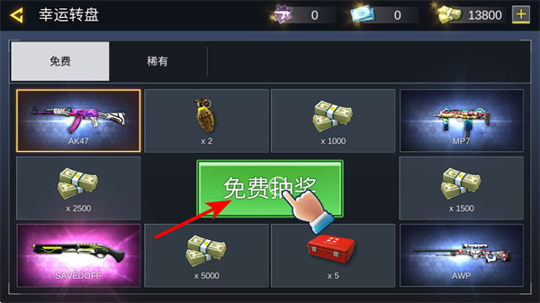 1、進入游戲后,點擊免費抽獎可參與幸運轉盤活動,獎勵池中的武器和資源,優先獲取強力武器提升戰力。