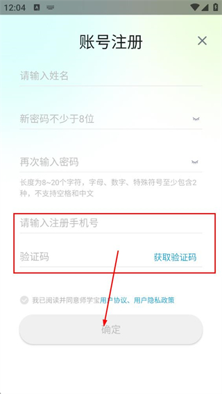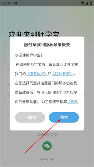 1、在師學寶服務條款和隱私政策概要彈窗中,點擊同意,進入賬號注冊流程。