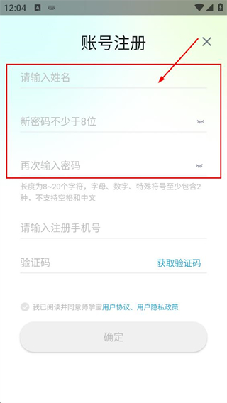 2、在賬號注冊界面,輸入姓名,設置不少于8位至少兩種的密碼并再次確認。