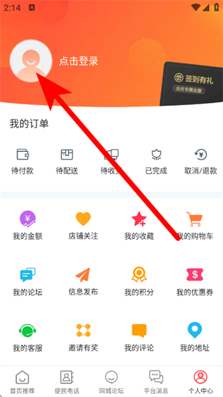 2、在個人中心頁面,點擊登錄區域,進入登錄頁面。