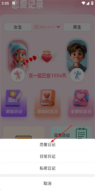 1、在戀愛記錄首頁點擊添加日記選項,彈出日記類型選擇菜單。
