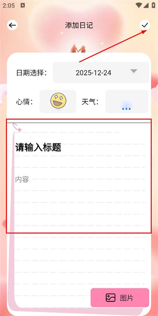 3、在添加日記頁面填寫標題和內容后,點擊右上角保存日記。