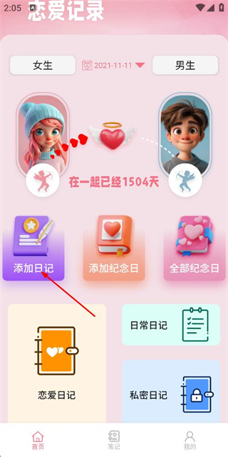 2、在菜單中選擇戀愛日記選項,進入添加日記頁面。