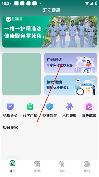 1、打開匯安醫療app首頁,點擊在線問診,進入在線問診頁面。