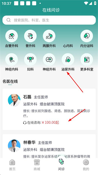 2、在在線問診頁面選擇對應科室,點擊目標醫生的在線咨詢入口,進入醫生主頁。